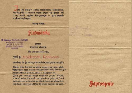 Zaproszenie na Studniówkę, dla mnie, czyli Waldemara Redmann'a. Studniówka odbyła się w naszej szkole mieszczącej się wówczas przy ulicy Gdańskiej.