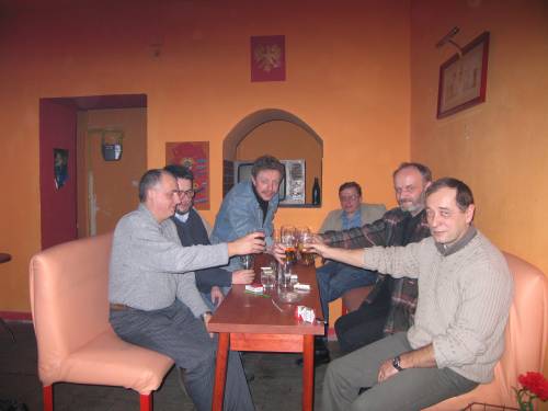 To ostatnie spotkanie klasowe w 2004 roku. Przy piwie złożyliśmy sobie życzenia Świąteczne i Noworoczne. Mamy nadzieje, że w przyszłym roku uda nam się kontynuować tradycję naszych spotkań. Na to spotkanie po raz pierwszy zawitał Marek O. mieszkający obecnie w Olsztynie. Była to bardzo miła niespodzianka. Dzięki temu udało się umieścić kolejne brakujące zdjęcie przedstawiające Naszą klasę . Ustaliliśmy, że wiosną bądź latem, z inicjatywy Marka, być może zorganizujemy spotkanie gdzieś na Mazurach. Czas pokaże..